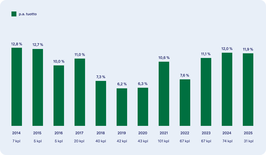Tuotto p.a. tarkoittaa kaikkien 30.4.2025 mennessä erääntyneiden lainojen vuosituotoista laskettua keskiarvoa. Aineiston ensimmäisen lainan liikkeeseenlasku oli tammikuussa 2013 ja ensimmäinen erääntyminen toukokuussa 2014, viimeisin liikkeeseenlasku oli huhtikuussa 2024 ja viimeisin erääntyminen huhtikuussa 2025. Vuosituotot tarkoittavat kunkin lainan efektiivistä tuottoa nimellisarvolle laskettuna liikkeeseenlaskupäivästä eräpäivään tai kokonaisuudessaan takaisinostettujen lainojen tapauksessa viimeiseen kaupankäyntipäivään saakka. Tuottoluvut huomioivat kaikki kulut mahdollisia merkintäpalkkioita lukuun ottamatta. Koonti ei sisällä puhtaasti preemionluonteisia sijoituksia. Huomaa, että historiallinen tuotto ei ole tae tulevasta tuotosta.